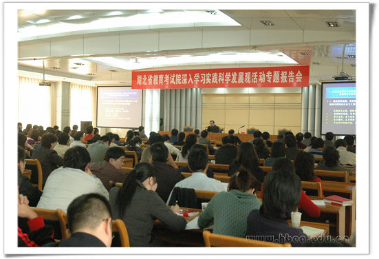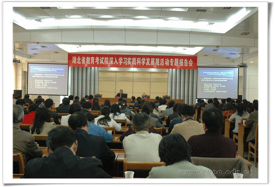 2008年10月28日下午,武漢大學(xué)黨委書記顧海良教授應(yīng)邀來我院作深入學(xué)習(xí)實踐科學(xué)發(fā)展觀活動專題報告。報告會由黨委書記、院長江暢主持,全院干部職工、《湖北招生考試》雜志社全體工作人員、其他院屬單位部門以上負責(zé)人共180多人聆聽報告。